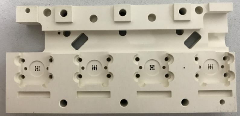 产品名:基座 材料:ofc 主要工艺:cnc 技术难点: --光通信产品关键部件 | 产品名:针板-05 材料:tekapeek cmf 主要工艺:cnc、钳工 技术难点: --微孔直径公差;0.01mm --显微镜30倍检测无毛刺 | 产品名:针板-08 材料:tekapeek cmf 主要工艺:cnc、钳工 技术难点: --微孔直径公差;0.01mm --显微镜30倍检测无毛刺 |